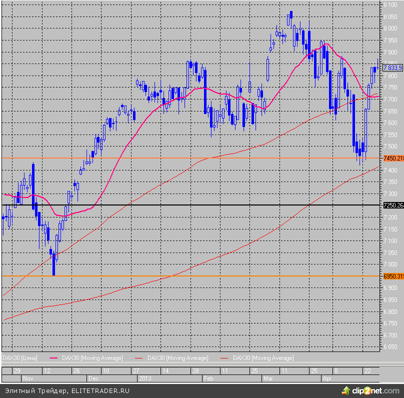 Котировки немецкого индекса DAX открылись небольшим «гэпом» вверх и пробили уровень 7850 пунктов и протестировал, 7870, однако затем откатился до 7840 пунктов.