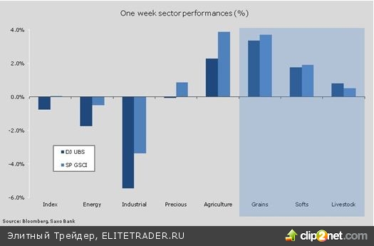 Как видно на приведенном ниже графике, неудовлетворительные результаты показал сектор промышленных металлов, которой был лишен всякой поддержки в условиях вялой экономической активности в Китае. Энергетический сектор тоже понес потери главным образом под влиянием продаж в сегментах природного газа и бензина. Драгоценные металлы продолжили свое осторожное восстановление во главе с палладием. Свою лепту внесло и золото: на момент написания этого обзора оно готовится завершить вторую неделю в плюсе в условиях конкурентной борьбы покупателей на физическом рынке и продавцов на бумажном рынке (биржевые индексные продукты и фьючерсы).