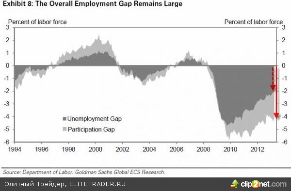 Goldman Sachs утверждает, что привязка экономических стратегий к уровню безработицы - неправильный шаг. Безработица, формально снижающаяся, не является таковой в реальности - так как она снижается исключительно за счет того, что люди, отчаявшиеся найти работу, из категории "безработные" смещаются в категорию "неактивные". Последняя категория выпадает из статистического класса "рабочая сила" и не учитывается Департаментом труда. C начала рецессии в 2007 году по настоящий момент трудовая сила сократилась в объеме на 2.7%.