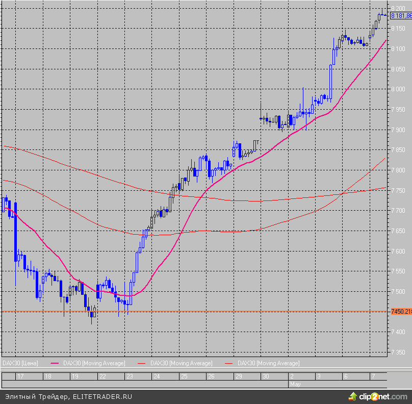 Немецкий индекс DAX умеренно растет в течение дня, и в очередной раз сегодня индикатор достиг своего исторического максимума, преодолев сопротивление на уровне 8150 пунктов и достиг 8185. Между тем, по словам Дэвида Фуркайга, технического аналитика из 3rd Wave Consult, целью для DAX является отметка 8700 пунктов.