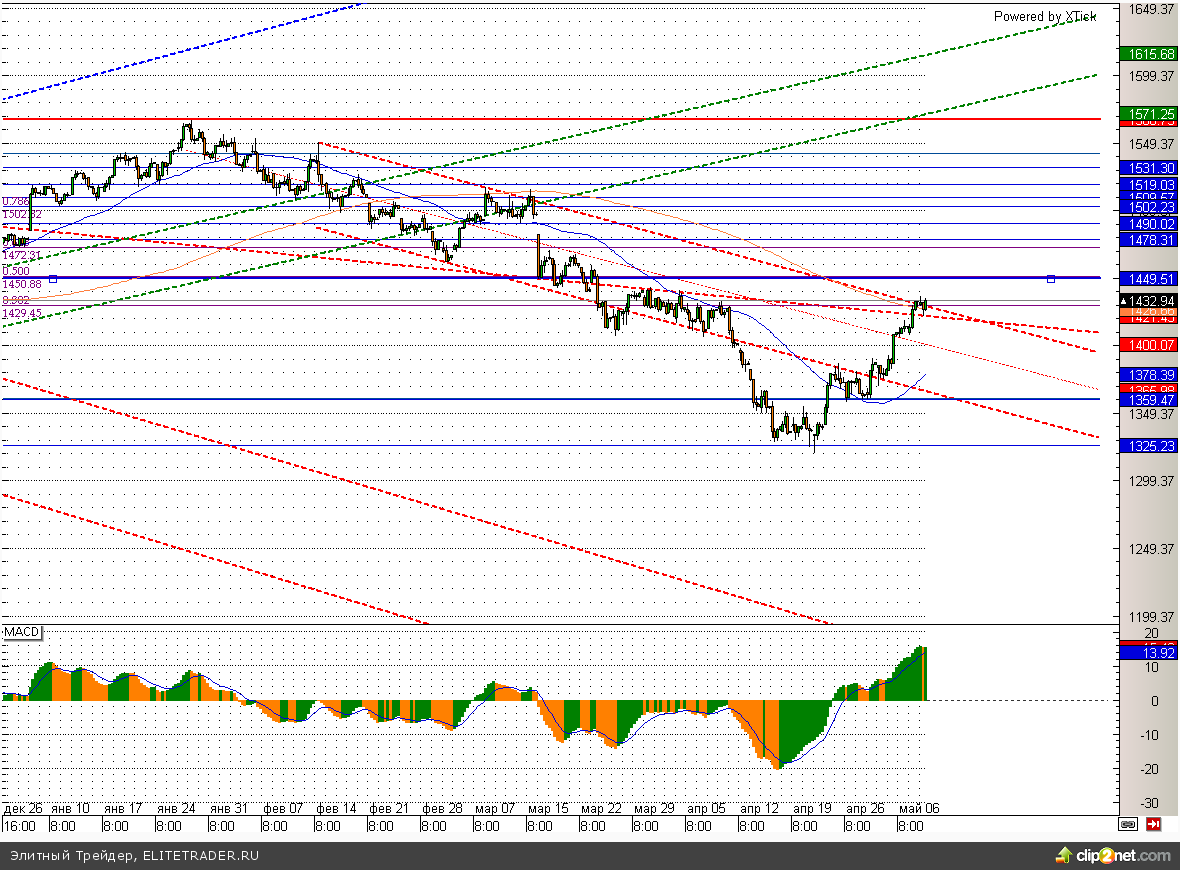 Российский рынок завершил предпраздничную торговую сессию ростом. При этом если в первой половине торгов наблюдалось достаточно вялое коррекционное движение, то после открытия американского рынка «быки» вновь взяли инициативу в свои руки и пошли на очередной штурм 1430 по ММВБ. Закрепиться выше данной отметки к концу торгов все-таки удалось, и, индекс может отправиться к следующей цели на уровне 1450, где сейчас проходит 100 – дневная скользящая средняя и 50% коррекции по Фибоначчи.