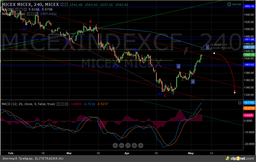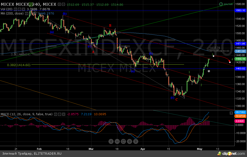На российском рынке не так давно начался хороший рост. ММВБ в последние дни показывает сильную динамику и уже добрался до своего значимого сопротивления на отметке 1430. На данном уровне проходит краткосрочная трендовая линия, которая и может встать на пути дальнейшего роста. Между тем существует 2 сценария развития событий о том как поведет себя российский рынок в мае.