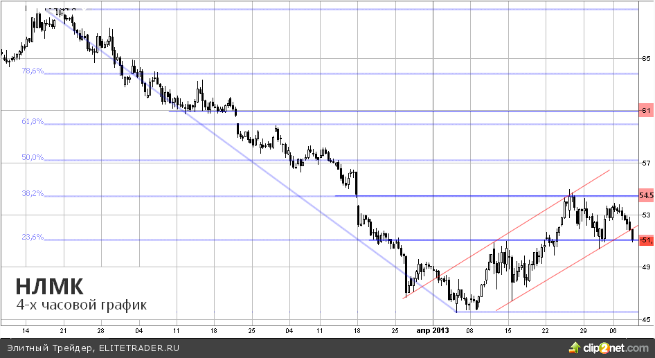Коррекция на графике НЛМК, судя по всему, закончится на отметке 55 рублей (уровень Фибоначчи 38%), графическая картина благоволит медведям. Несмотря на локальные поддержки, веры в самостоятельный рост все меньше, особенно во время эпической «независимости» динамики российских индексов от индексов американских.