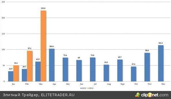 За 1-й квартал 2013 года совокупный импорт превысил 370 тонн, что составляет около 13% от мирового производства золота в прошлом году. Остается только догадываться, какими будут апрельские цифры, которые обычно предоставляются с шестинедельной задержкой.