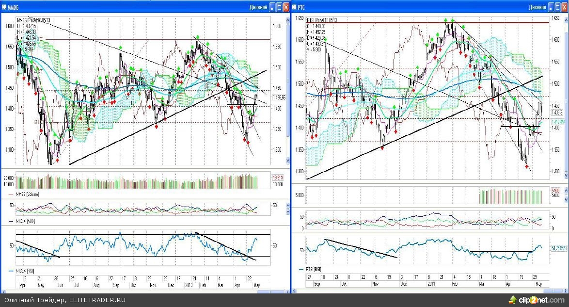 При этом индекс ММВБ отразился ровно от скопления дневных скользящих средних ЕМА100 и ЕМА200, также упершись в последнюю линию нисходящего тренда.