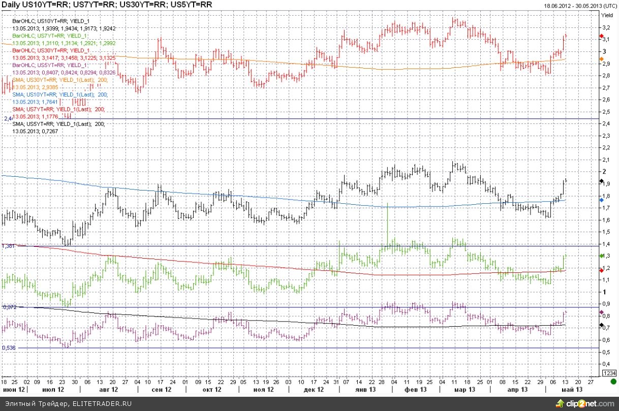 С учетом, того, что усилиями ФРС и проблем в зоне евро, средние ставки по казначейским облигациям снизились, обслуживание долга будет менее обременительным, что с одной стороны позитивно для трежерис, с другой снижает потребности в проводимых Федом выкупах. Отметим, что в пятницу доходность казначейских облигаций резко пошла вверх, превысив 1,9% по десятилеткам, то есть, обновив апрельские максимумы.