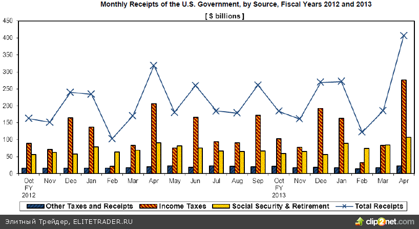 Безусловно, двукратный месячный рост это в большей степени результат сезонный и наблюдаемый в этот период каждый год в связи с истечением в апреле сроков подачи деклараций по налогу на доходы физлиц, но в целом нельзя не отметить сокращение бюджетного дефицита за прошедшие семь месяцев фискального 2013 года до $487 млрд. против $720 млрд. за аналогичный период прошлого года.