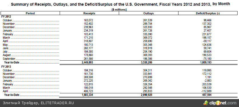 Между тем, стоит обратить внимание на обнародованные в пятницу цифры по балансу федерального бюджета США, который за прошедший месяц показал рекордный профицит с апреля 2008 года, то есть за пять лет, составив $112,9 млрд., в чем, по всей видимости, в том числе заслуга проведенных фискальных ужесточении американским правительством. Отражение этого можно найти в росте доходной части бюджета относительно марта 2012 года до рекордных $406,723 млрд.