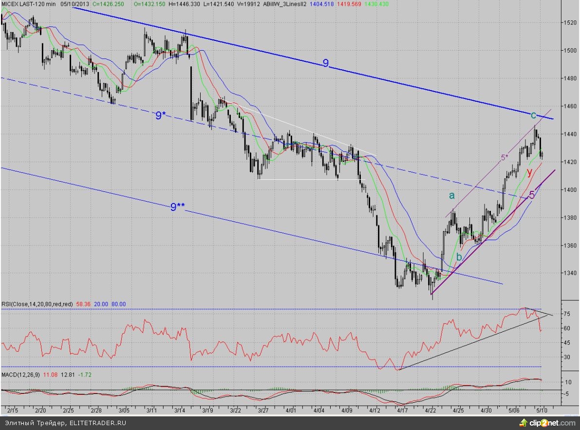 Исследуя 2-часовой график индекса ММВБ, видим, что открывшись на тех же уровнях, котировки возобновили рост и, преодолев предыдущий локальный максимум, на этот раз достигли верхней границы растущего канала (5-5*). От данного рубежа начались продажи, и котировки не только потеряли всю накопленную за утро высоту, но и ушли в минус. И только 2-часовой фрактал на продажу Y (1421,5 п.) и окончание торгов удержали «медведей» от дальнейшей атаки.