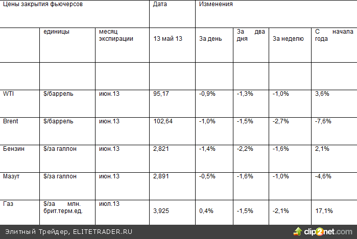 Опережающий рост цен нефти в США привел к тому, что контанго (превышение цены фьючерсов по нефти марки WTI с погашением в сентябре над ценой июньского фьючерса) уменьшилось до нулевых отметок. По нефти марки Brent сохраняется беквордация и цены дальних фьючерсов на -0,8% ниже цен ближайших фьючерсов. Продолжающееся сближение цен по обе стороны Атлантики сохраняется и разница цен ближайших фьючерсов бочки нефти марки Brent и североамериканской легкой нефти марки WTI на закрытие 13 мая 2013 года составляет $7,47 за баррель.
