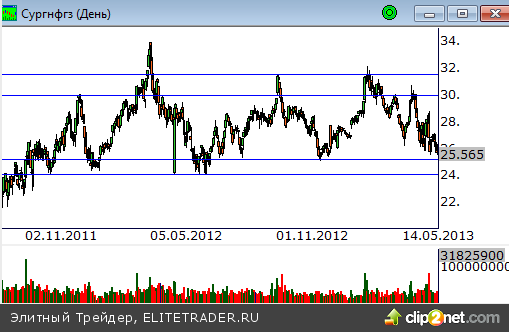 Цены тестируют минимумы года. Технически зона с диапазоном 25.20-24 рубля является нижней границей широкого боковика. Поэтому обновление минимумов года не несет в себе значительной угрозы для цен. Пока будут лишь перспективы для теста уровней в районе отметки 24 рубля. В дальнейшем отбой от показанной поддержки станет началом новой волны движения внутрь боковика.
