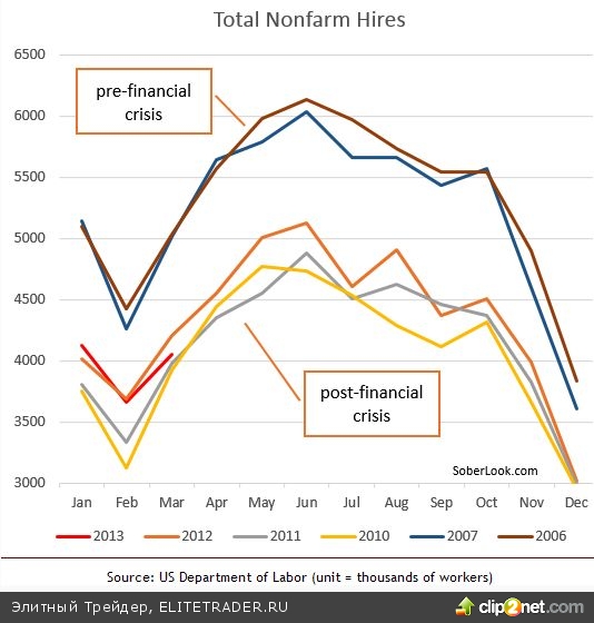 Последние данные по рабочим местам и безработице в Америке внушают оптимизм, однако на самом деле рынок труда США по-прежнему серьезно болен, и это видно по графику найму персонала, который не улучшился со времен рецессии.