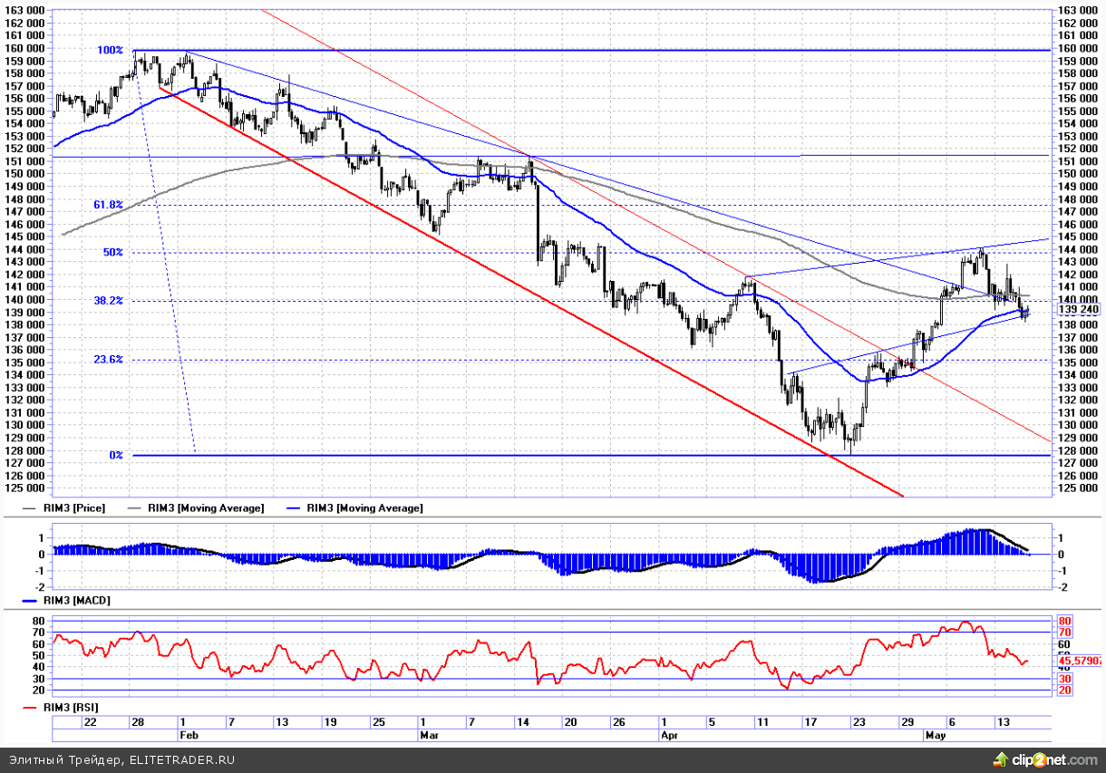 Что касается ближайших перспектив, то мы пока продолжаем достаточно сдержанно смотреть на текущее положение дел. Шансов на безудержный рост сейчас мало. К тому жен пока нет практически никаких технических предпосылок для формирования полноценной волны роста выше района недавних максимумов около 144000п. Наоборот, в силу валютного фактора (рассчитываем на некоторую слабость рубля) остаются неплохие шансы для продолжения умеренного снижения, даже несмотря на то, что осцилляторы находятся на нейтральной территории и пока не дают четких сигналов к активным действиям.