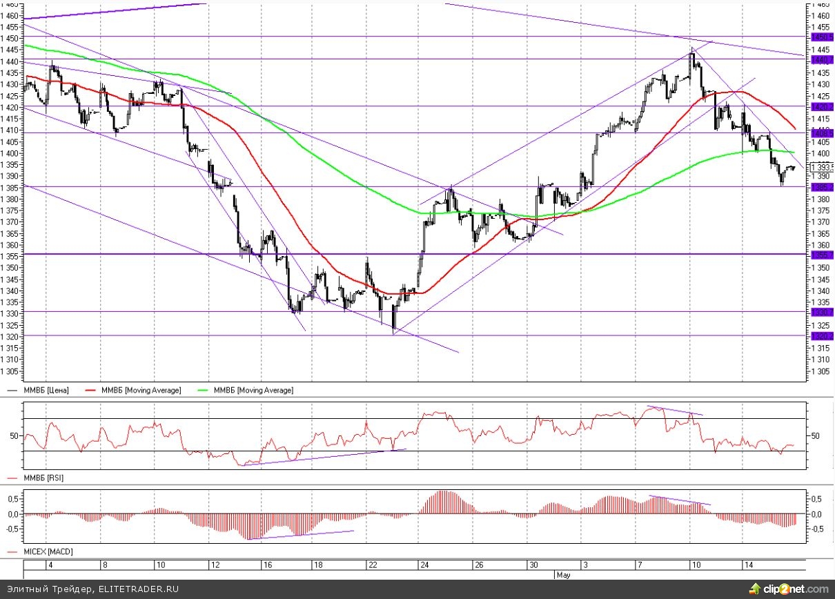 Давление на индекс вчера продолжали оказывать последствия дивидендного периода в отдельных бумагах, в частности в привилегированных акциях Сургутнефтегаза подешевевших более чем на 10% после отсечки. Сегодня покупатели будут искать подтверждающие возможное восстановление сигналы, коими будут пробой нисходящего микротренда от майских максимумов и соответственно пробой сопротивления 200-часовой средней на отметке 1400.