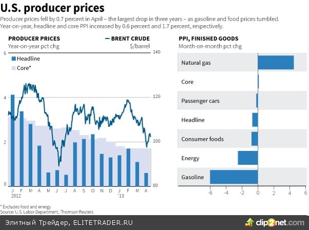 Откровенно слабая статистика обнародованная вчера как в Европе, так и в США если и не была воспринята как положительный аргумент относительно продолжения стимулирующей программы Федрезерва о сворачивании которой заговорили участники рынка, то, по меньшей мере, не помешала росту в большинстве секторов. Прежде всего, отметим публикацию инфляционных показателей, данных по индексу цен производителей, который, как и ожидали аналитики, в апреле показал снижение. Падение даже превысило консенсус прогноз, составив 0,7%, против ожидаемых 0,6%. На 2,5% снизились цены на энергоносители, на 0,8% цена на продукты питания.