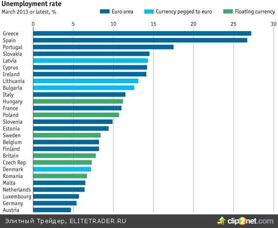 Кроме того, наблюдается сильная дивергенция по рынку труда между периферийными странами и центральными. Если в Германии безработица составила в марте всего 5.4%, то в Греции и Испании она достигла запредельных 27%. Разрыв безработицы среди молодежи еще больше – 7.6% в ФРГ и 56% и 64% в Испании и Греции соответственно. Economist.com