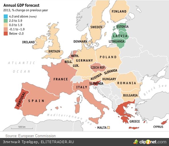 Последний прогноз Еврокомиссии по еврозоне за 2013 год выглядит неутешительно: прогнозируется рецессия на 0.4%, при этом наиболее сильное снижение будет в периферийных странах.
