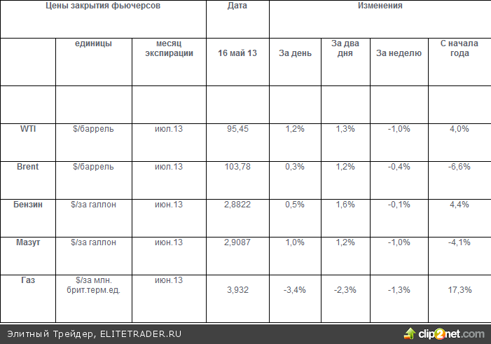Небольшое контанго (превышение цены фьючерсов по нефти марки WTI с погашением в октябре над ценой июльского фьючерса) сменилось незначительной беквордацией, когда это соотношение становится обратным -0,1% и рынок демонстрирует ожидание небольшого снижения цены. По нефти марки Brent сохраняется беквордация и цены дальних фьючерсов на -1,0% ниже цен ближайших фьючерсов. Можно констатировать сохраняющееся ожидания сближения цен на нефть по обе стороны Атлантики. Разница цен ближайших фьючерсов бочки нефти марки Brent и североамериканской легкой нефти марки WTI на закрытие 16 мая 2013 года составляет $8,3 за баррель.