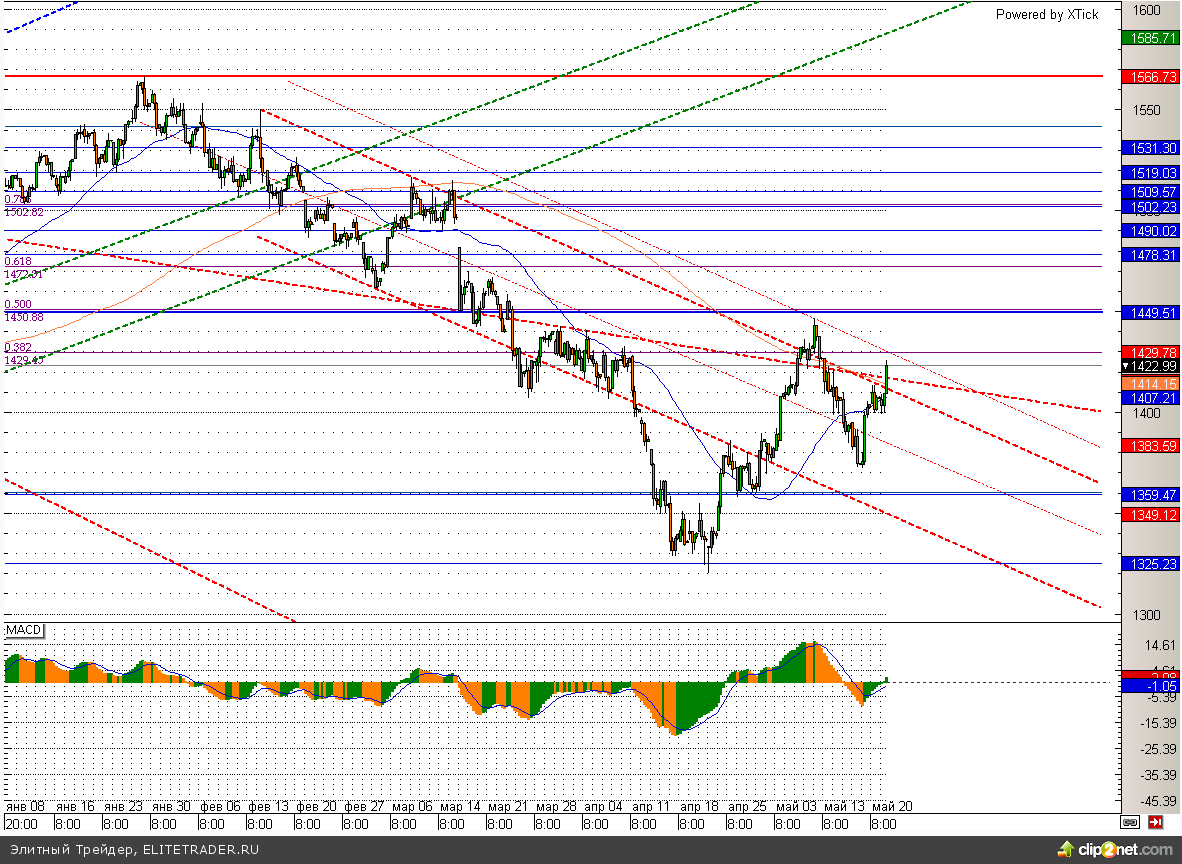 Между тем на этой краткосрочной эйфории ММВБ смог проколоть отметку 1415, что является нехорошим сигналом для «медведей». Правда, аналогичный прокол был 10 мая, после чего цены стремительно вернулись в проторгованный диапазон. Поэтому ключевым сопротивлением для «быков» на ближайшее время стала отметка 1430. Вот если пробить и ее в ближайшее время покупателям удастся, то поход на 1450 будет практически гарантирован.