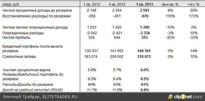 Комментарий. Мы ожидаем, что ключевой статьей этого квартального отчета станут расходы на резервы по кредитному портфелю в связи с их относительно низким уровням по отдельным проблемным кредитам на предыдущую отчетную дату. Так, резерв по кредитам Кондопожскому ЦБК, процедура банкротства которого началась уже в 2013 году, в отчетности за 2012 год составил лишь 5%. В марте менеджмент банка также отмечал, что уровень резервирования по проблемному кредиту крупной логистической компании, оказавшему влияние на отчетность Возрождения за 3-й кв., составивший на конец 2012 года 60%, может быть повышен до 75% в текущем году.