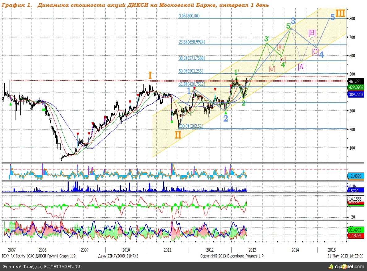 В ноябре 2011 года цены акций ДИКСИ прекратили коррекционное снижение в рамках волны II и начали двигаться вверх, таким образом, стартовал очередной масштабный импульс роста – волна III. В настоящее время в начале развития растянутая подволна 3’ в волне 3. Окончательной целью волны III видим уровень 800 рублей за акцию, что на 74% выше текущего уровня. Предполагаем, что в рамках подволны 3’ может развиться коррекция, в рамках которой котировки торговой сети могут снизиться к отметке 420 рублей за акцию, чем можно воспользоваться для открытия длинных позиций.