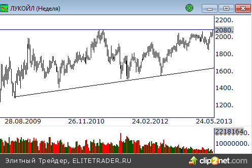 Цены достигли верхней границы широкого сужающегося диапазона, расположенной на максимумах 2011 года вблизи отметки 2090 рублей. С технической точки зрения, а также благодаря внешнему фону, цены начнут откатываться вниз. В целом напрашивается постепенное снижение внутрь показанной фигуры. Существенная поддержка для покупателей проходит на уровнях предыдущей коррекции в районе отметки 1850 рублей.