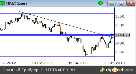 Накануне цены пробили линию предложения зимнего нисходящего тренда. Это позволило покупателям поднять котировки к осевой линии широкого бокового канала, расположенной в районе отметки 1450 пунктов. Данное сопротивление индекс не прошел. Учитывая внешний фон на открытии торговой сессии, котировки отобьются от него вниз. Если в дальнейшем покупатели не смогут вывести цены в верхнюю область боковика, то мы будем вправе рассчитывать на движение внутрь диапазона 1450-1320 пунктов.