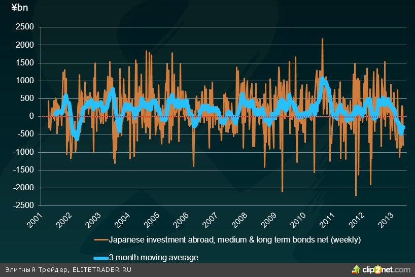 Текущая ситуация свидетельствует о том, что инвесторы активно избавляются от японских бумаг. Куда же они направляют полученные деньги? Неужели в иностранные активы? Оказывается, это не так. Динамика чистых покупок иностранных облигаций со стороны крупных финансовых институтов Японии свидетельствует, что показатель находится на минимальной отметке с 2001 года.