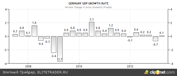 Экономика Германии остается чуть ли не единственным светлым пятном на карте еврозоны, переживающей самую длительную рецессию в своей истории. Тем не менее, несмотря на положительную динамику, особенно обольщаться не стоит: она возникла благодаря низкой базе предыдущего квартала. Напомню, в октябре-декабре 2012 года, ВВП Германии сократился на 0,7%, что стало наиболее серьезным спадом с 1-го квартала 2009 года. Таким образом, говорить о восстановлении преждевременно.