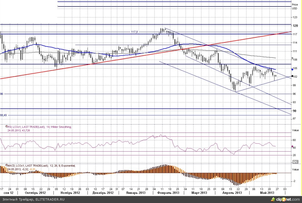 На этой неделе цены на черное золото выглядели достаточно слабо. После того, как котировки (Brent) вплотную подошли к своим ключевым среднесрочным уровням сопротивления, появилась масса желающих продать и к тому же внешний фон попутно начал ухудшаться. В итоге тестирование отметки в $105 за баррель совпало с максимумом рынка, за которым последовало постепенное снижение. В результате уже сейчас котировки вновь вернулись в рамки нисходящего канала. Что касается ближайших перспектив на рынке нефти, то с точки зрения техники вероятность развития медвежьего сценария сейчас все-таки выше. Ближайший более-менее значимый уровень поддержки расположен в районе $99 за баррель. К тому же отметим, что драйвером распродаж на рынке черного золота может выступить и назревшая коррекция на американском рынке акций.
