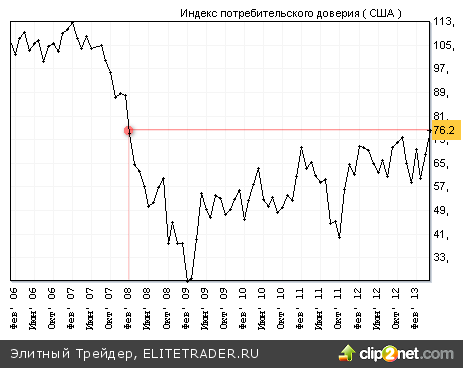 Весь день в фокусе рынка была публикация блока американской статистики, и она не подвела: индекс потребительского доверия показал 76.2 пункта, что стало максимальным значением более чем за 5 лет, заметно обогнав прогноз (средний прогноз по опросу от Bloomberg – 71.2).