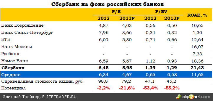 Вместе с тем, бурного роста в ближайшее время мы не ожидаем. Сравнение с другими российскими и зарубежными банками указывает на то, что Сбербанк не выглядит дешевым на текущих уровнях, и в ближайшее время рост не будет даваться его акциям легко. В данный момент на российском рынке более привлекательным, на наш взгляд, выглядит ВТБ: бумаги были под сильным давлением в ожидании SPO, но банку удалось очень грамотно организовать размещение с привлечением стратегических инвесторов, и теперь акции ВТБ могут частично отыграть свой дисконт к Сбербанку.