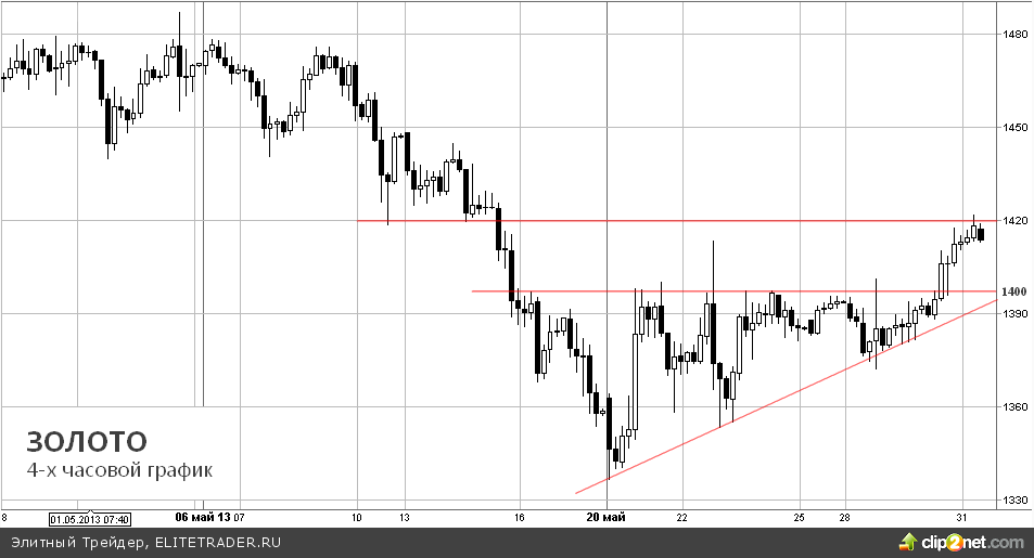 Таким образом, начавшийся 20 мая отскок наверх остается в силе, долго сопротивляющийся уровень $1400 за унцию был преодолен, локальное сопротивление проходит на $1420/тр.унц.