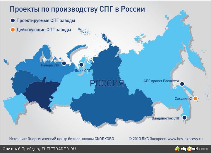 В России сейчас работает только один СПГ-завод в рамках проекта «Сахалин-2», который был введен в эксплуатацию в 2009 году. Контрольный пакет акций этой компании принадлежит Газпрому. Уже в 2010 году завод вышел на проектную мощность – 9,6 млн тонн СПГ в год. Основной покупатель – Япония. Сейчас сжиженный газ проекта занимает 4,5% от мирового рынка СПГ. К 2018 году Газпром планирует запустить Владивосток-СПГ мощностью 5 млн тонн.