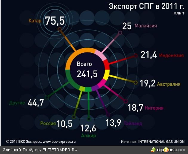 Крупнейший экспортер сжиженного газа – Катар (32% рынка). Однако сейчас страна не рассматривает варианты дальнейшего наращивания мощностей производства СПГ. По мере истощения ресурсной базы утрачивают свои позиции также Алжир и Индонезия. Зато противоположные тенденции наблюдаются в Австралии и Северной Америке.