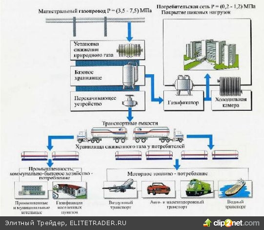 Природный газ, охлажденный после очистки от примесей до температуры конденсации (-161,5 градус по Цельсию), превращается в жидкость, которую и называют сжиженным природным газом (СПГ). В одной и той же емкости сжиженного природного газа уместится в 600 раз больше, чем обычного. Сжижают газ на специальных заводах, потом его закачивают в газовозы и переправляют в другие страны. В пункте назначения газ возвращают в первоначальное состояние, то есть подвергают процессу регазификации, и отправляют по трубам до конечного потребителя, как правило в те районы, которые находятся далеко от магистральных трубопроводов.