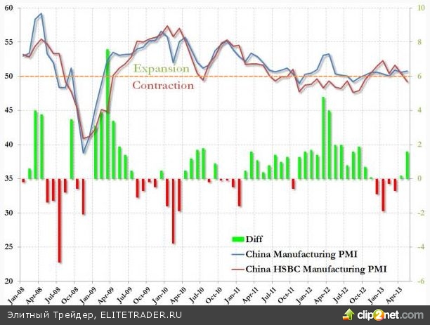 Согласно данным компании HSBC, которая ориентируется на мелкие и средние предприятия, индекс деловой активности менеджеров по снабжению в мае снизился до 49,2 после 50,4, зафиксированных в апреле. В то же время официальные данные, ориентированные в основном на крупные государственные предприятия, свидетельствуют о росте индекса до 50,8. В результате спред между двумя методиками подсчета вновь увеличился.