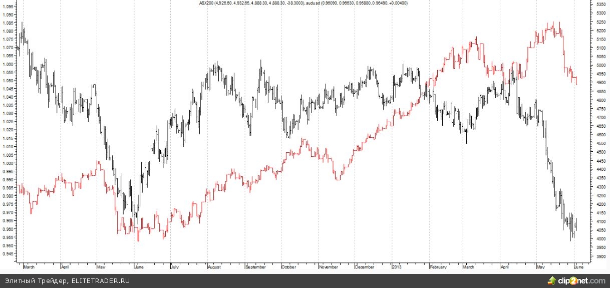 Предлагаю обратить внимание на динамику австралийского индекса ASX200 и котировок валютной пары AUD/USD.