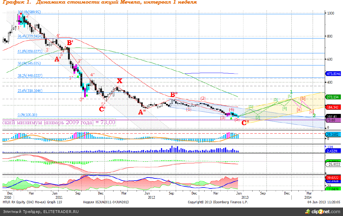 В течение без малого 2,5 лет котировки акций «Мечела» находятся в фазе снижения. В январе 2011 года «Мечел» отметился на уровне 989,95 рублей, после чего двинулся вниз, формируя глубокое коррекционное снижение в форме двойного зигзага