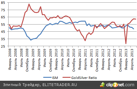 Слабость серебра была связана с публикацией американского индекса менеджеров по закупкам в сфере производства от ISM, который за май упал ниже 50. Дело в том, что серебро с его высоким удельным весом инвестиционного спроса в структуре потребления все же остается промышленным металлом. Ввиду этого коэффициент gold/silver живо реагирует на показатель от ISM, характеризуясь тесной обратной корреляцией.