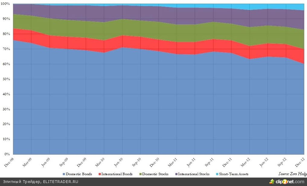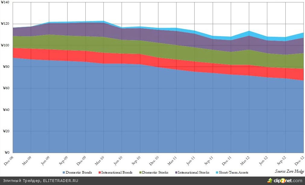 Так, доля акций японских эмитентов в портфеле фонда составила 12,3% в 3-м квартале и 14,5% в 4-м квартале 2012 года, а доля акций зарубежных эмитентов приблизилась к критической отметке в 14%. В то же время удельный вес японских облигаций находится на минимальной отметке в 69%.