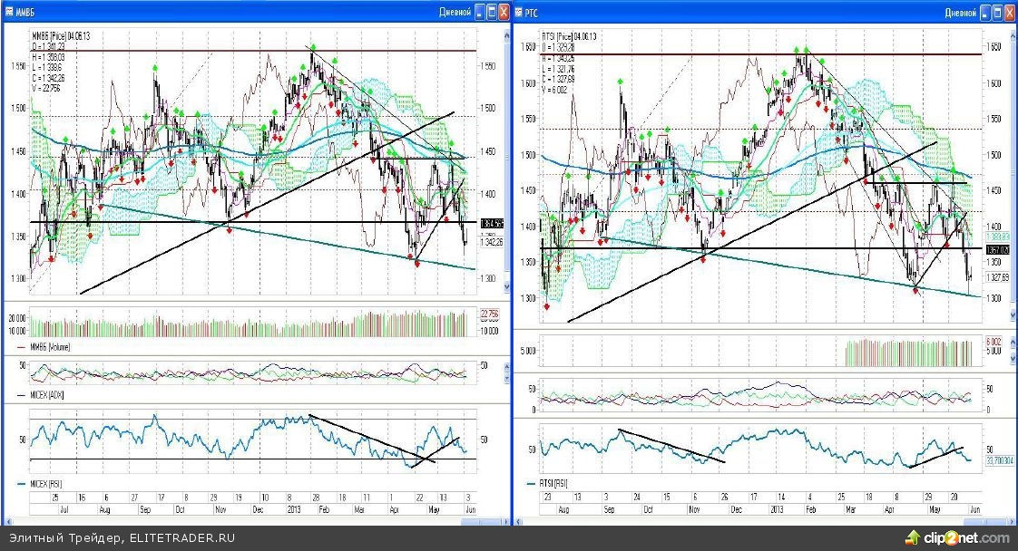 Если внимательно рассмотреть дневные графики ведущих индексов ММВБ и РТС, то можно найти несколько соответствий. Например, на них легко просматривается наклонная линия поддержка, соединяющая минимумы августа, ноября 2012 года и апреля текущего года. И хотя индекс ММВБ имеет еще небольшой запас хода до указанной рубежа примерно до района 1310 пунктов, то индекс РТС еще в понедельник сделал четвертый заход на данный уровень поддержки. Для «быков» на текущий момент этот уровень как последний оплот надежды, ведь если и он падет, то перед нами неминуемо откроется простор для дальнейшего снижения. А пока этот наклонный рубеж не сдан, шансы на отскок индексов наверх, довольно высоки.