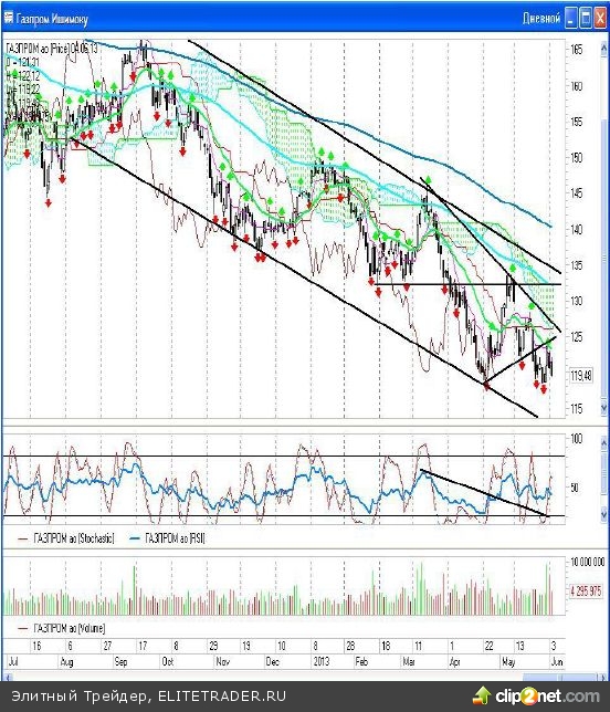 Вчера анализируя дневной график акций «Газпрома» я пришла к выводу, что вероятнее всего двойная конвергенция может превратиться в тройную, если в ближайшие дни мы увидим еще один заход котировок на район 118 рублей. Для появления данного сигнала необходим прокол отметки 118,09 рублей и обратный выкуп от неё.