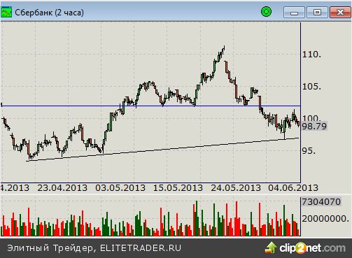 Схожая картина с предыдущей. Диапазон движения цен сейчас ограничен локальным ап-трендом и горизонтальным уровнем сопротивления на отметке 102 рубля. Пробой линии спроса даст толчок к снижению котировок к минимумам года с потенциалом их пробоя и перспективой движения в район отметок 90-91 рубль. Соответственно выход за отметку 102 откроет ценам дорогу к отметке 105 рублей.