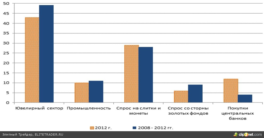 Согласно отчету Всемирного совета по золоту за 2012 год, годовой спрос в физическом выражении снизился на 4% до 4405,5 тонн, в стоимостном выражении спрос на драгоценный металл достиг рекордного уровня в $236,4 млрд. Увеличение спроса центральных банков в физическом выражении отчасти компенсировало снижение спроса со стороны ювелирной промышленности. Спрос со стороны центральных банков в период с 2008 по 2012 гг. составлял порядка 4%, а в 2012 году составил около 12% от величины общего спроса.