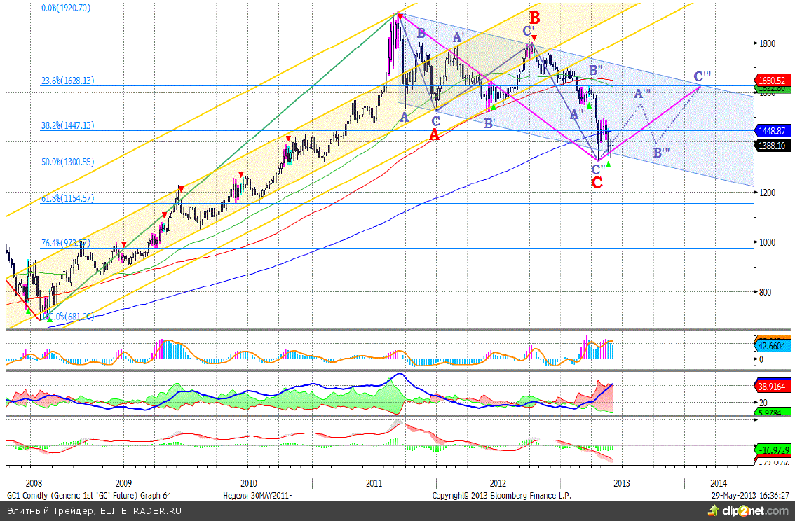В течение 3 лет, с IV квартала 2008 года по сентябрь 2011 года, формировалась фаза роста стоимости золота. За этот период котировки металла выросли на 182,04% с отметки $681,0 за тройскую унцию до значения $1920,7. По достижении указанного уровня цены на драгоценный металл начали коррекционное снижение, в результате чего в апреле текущего года достигли уровня $1323,0 за унцию (-31,12%). Коррекция развивается в рамках нисходящего канала, который обозначен на графике, приведенном выше, светло-синим цветом. В настоящее время котировки металла находятся у нижней границы канала, где они имеют высокие шансы получить поддержку. Кроме того, коррекционный зигзаг выглядит сформированным, что говорит о том, что в ближайшие месяцы нас ожидает рост котировок золота, целью которого видим уровень $1630 за тройскую унцию, что более чем на 17% выше текущего уровня