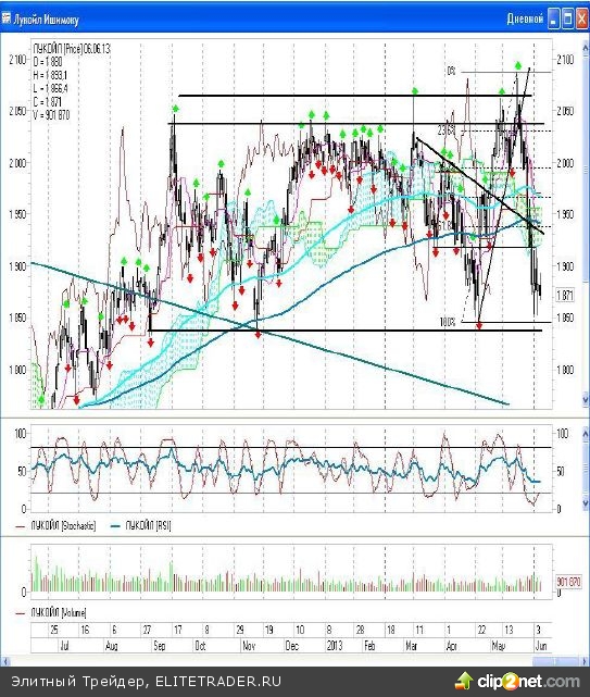 Акции «Лукойла» на протяжении всей этой недели торгуются в районе нижней границы большого бокового канала. И так как пока покупателям удается сохранить нетронутым ключевой рубеж, проходящий через отметки 1829; 1837,6 и 1846,7 рублей, то вероятность отскока котировок от текущих уровней, растёт.