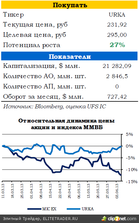 С другой стороны, осуществление сделки может повысить долговую нагрузку компании. На конец 2012 года величина чистого долга составляла $2,3 млрд, соотношение Чистый долг/EBITDA находилось на уровне 0,95х. По прогнозам аналитиков рейтингового агентства S&P, сделка по выкупу акций, а также выплата дивидендов в 2013 году приведет к повышению Чистого долга/EBITDA до 1,5х-1,6х к концу года. Такое соотношение укладывается в целевые уровни Уралкалия (1-2х), однако негативно скажется на возможности повышения кредитного рейтинга компании. Кроме того, финансовые расходы по приобретению пакета акционера снизят возможности для продолжения реализации программы обратного выкупа акций. В целом, новость мы оцениваем нейтрально для котировок компании.