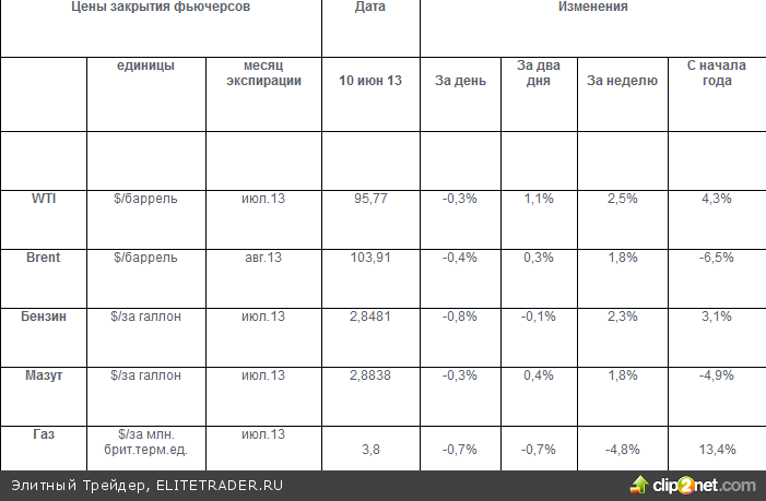 За океаном цены дальних октябрьских фьючерсов почти равны по величине ценам фьючерсов на июль. То есть рынок не ожидает выраженных движений цены. А вот на европейскую нефть марки Brent сохраняется беквордация и цены дальних фьючерсов на -0,8% ниже цен ближайших фьючерсов. Разница цен ближайших фьючерсов бочки нефти марки Brent и североамериканской легкой нефти марки WTI на закрытие 10 июня 2013 года составляла $8,14 за баррель.