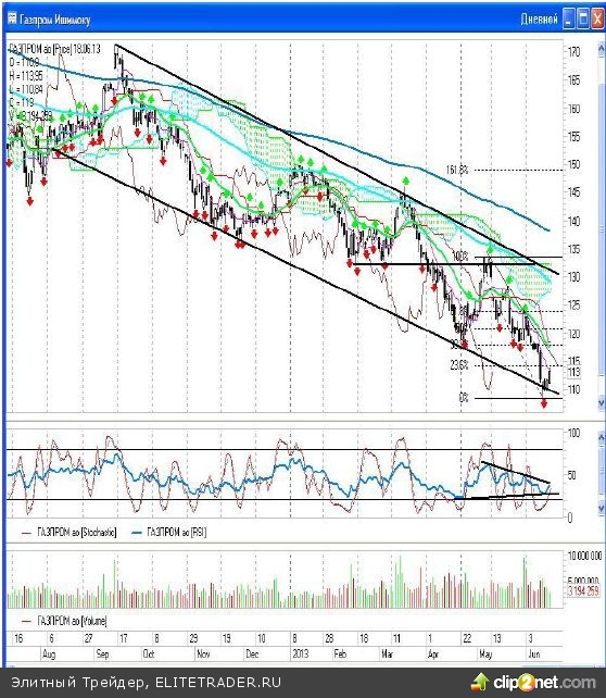 Вчера я писала о том, что хотя акции «Газпрома» и не допадали и не достигли своей основной цели в виде района 106-107 рублей, их покупки от нижней границы нисходящего тренда вполне могут быть оправданы благодаря наличию конвергенций, образованных на осцилляторе RSI между минимумами 23 апреля и 14 июня. И, как мы видим, цены на акции вчера действительно поднялись до 113 рублей и прирост по итогам дня составил 1,4%.